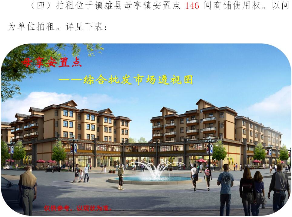 經(jīng)鎮(zhèn)雄縣人民政府批準(zhǔn),受相關(guān)部門(政府)委托,公開拍租位于鎮(zhèn)雄縣易地扶貧搬遷工程呢嚕坪安置點(diǎn)7棟獨(dú)立商鋪使用權(quán)、高山大地安置點(diǎn)27間(棟)商鋪使用權(quán)、魯家院子安置點(diǎn)24間(棟)商鋪使用權(quán)、母享安置點(diǎn)146間商鋪使用權(quán)、以勒物流城安置點(diǎn)67間(棟)商鋪使用權(quán)、碗廠安置點(diǎn)114間商鋪使用權(quán)。相關(guān)事項(xiàng)如下: